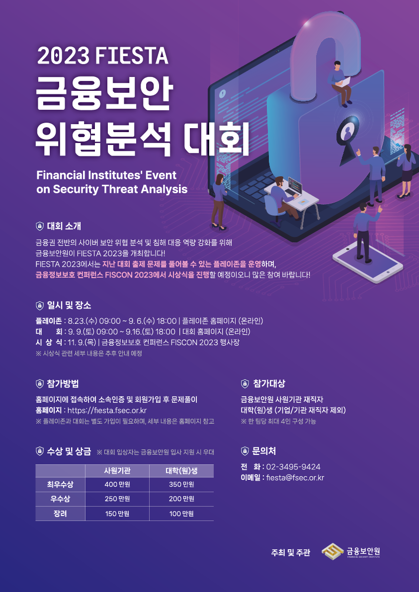 금융권 전반의 사이버 보안 위협 분석 및 침해 대응 역량 강화를 위해 금융보안원이 FIESTA 2023을 개최합니다!