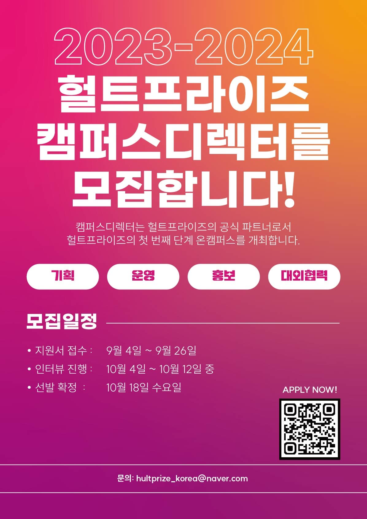- 참여 대상: 헐트프라이즈 캠퍼스디렉터 활동에 관심이 있는 대학생
