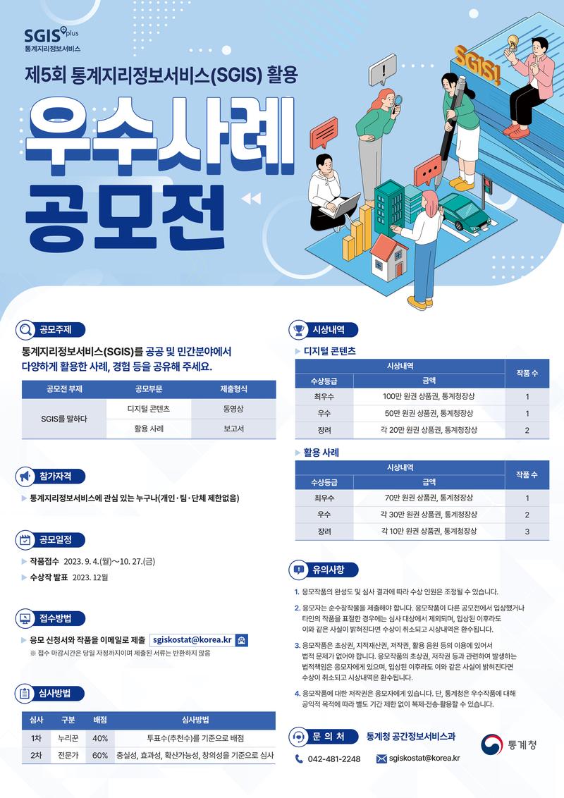 통계청에서는 공공정책, 민간경제, 교육·연구분야 등에서 통계지리정보서비스(SGIS)를 활용한 우수한 사례를 발굴·공유하고자 「제5회 SGIS 활용 우수사례 공모전」을 개최하오니 관심 있는 분들의 많은 참여 바랍니다.