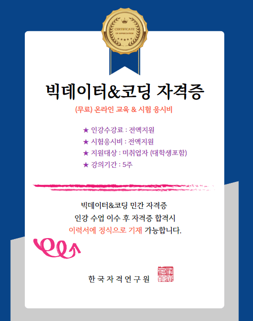 빅데이터자격증 무료 인강 제공 및 시험응시료 지원 수강생 모집