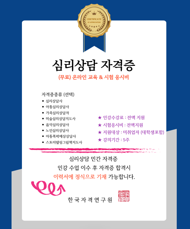 - 자격증 종류 : 심리상담사 / 아동심리상담사 / 가족심리상담사 /