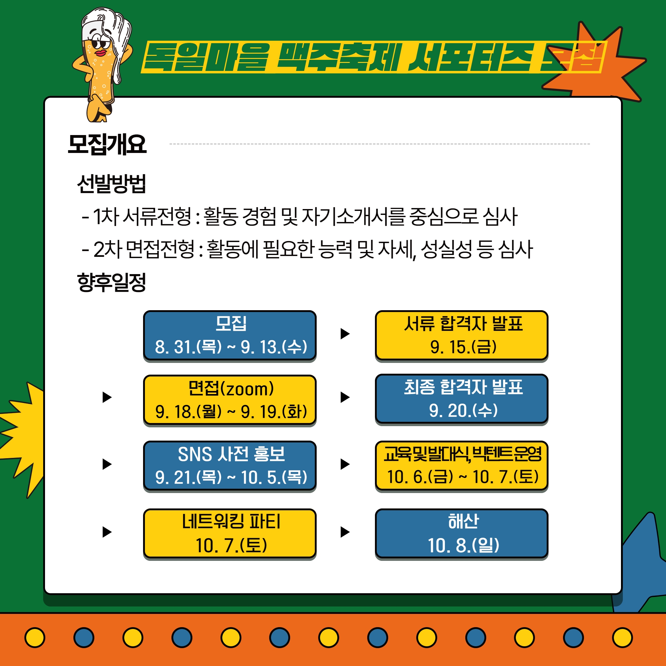 - 독일마을 맥주축제 기간(10/6~8)동안 모든 일정 참석 가능한 자