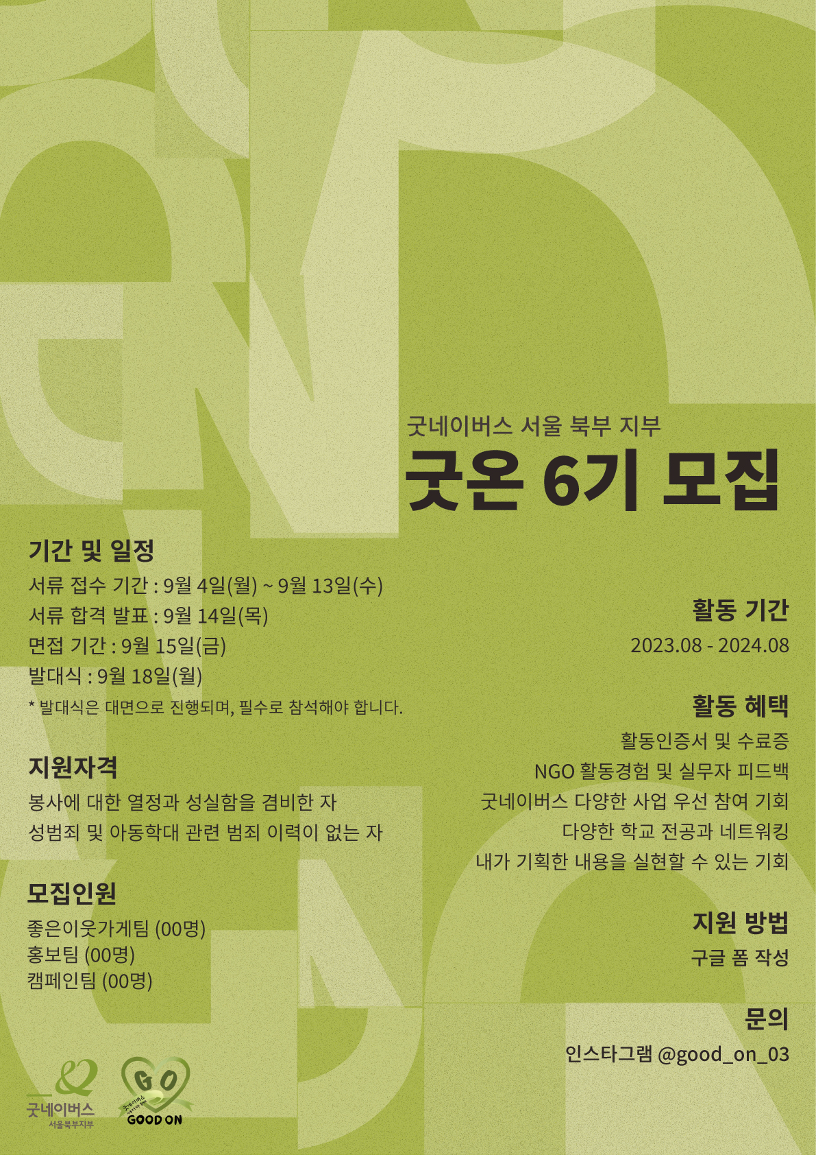 '굿온'은 굿네이버스와 함께하며, 이를 위한 소상공인 나눔 문화 확산 활동, 캠페인, 홍보 등의 활동을 하고 있습니다. 저희와 함께 아동을 위한 따뜻한 온기를 내뿜을 준비가 된 분들을 모집합니다!