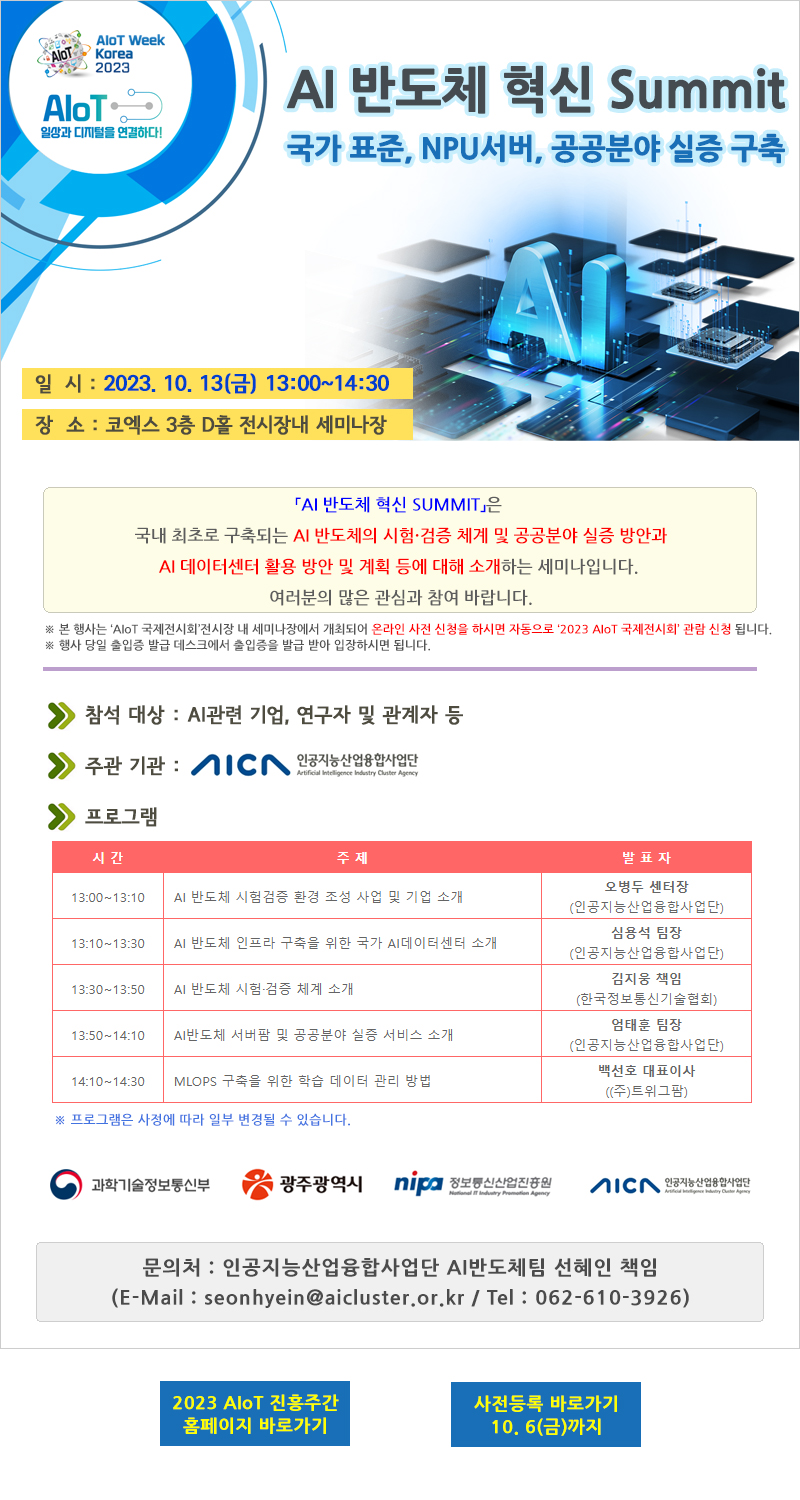 개최목적 : 국내 최초로 구축되는 AI반도체의 시험·검증 체계 및 NPU 서버 및 공공분야 실증 방안 소개, AI 데이터센터 활용방안 및 계획 등의 정보 공유를 통한 협력의 장 마련