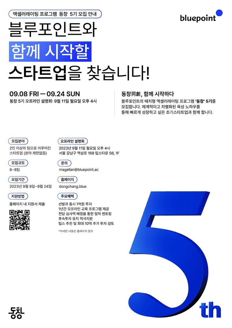 [블루포인트] 초기스타트업 투자육성 프로그램 ‘동창 5기’ 모집(~9/24)