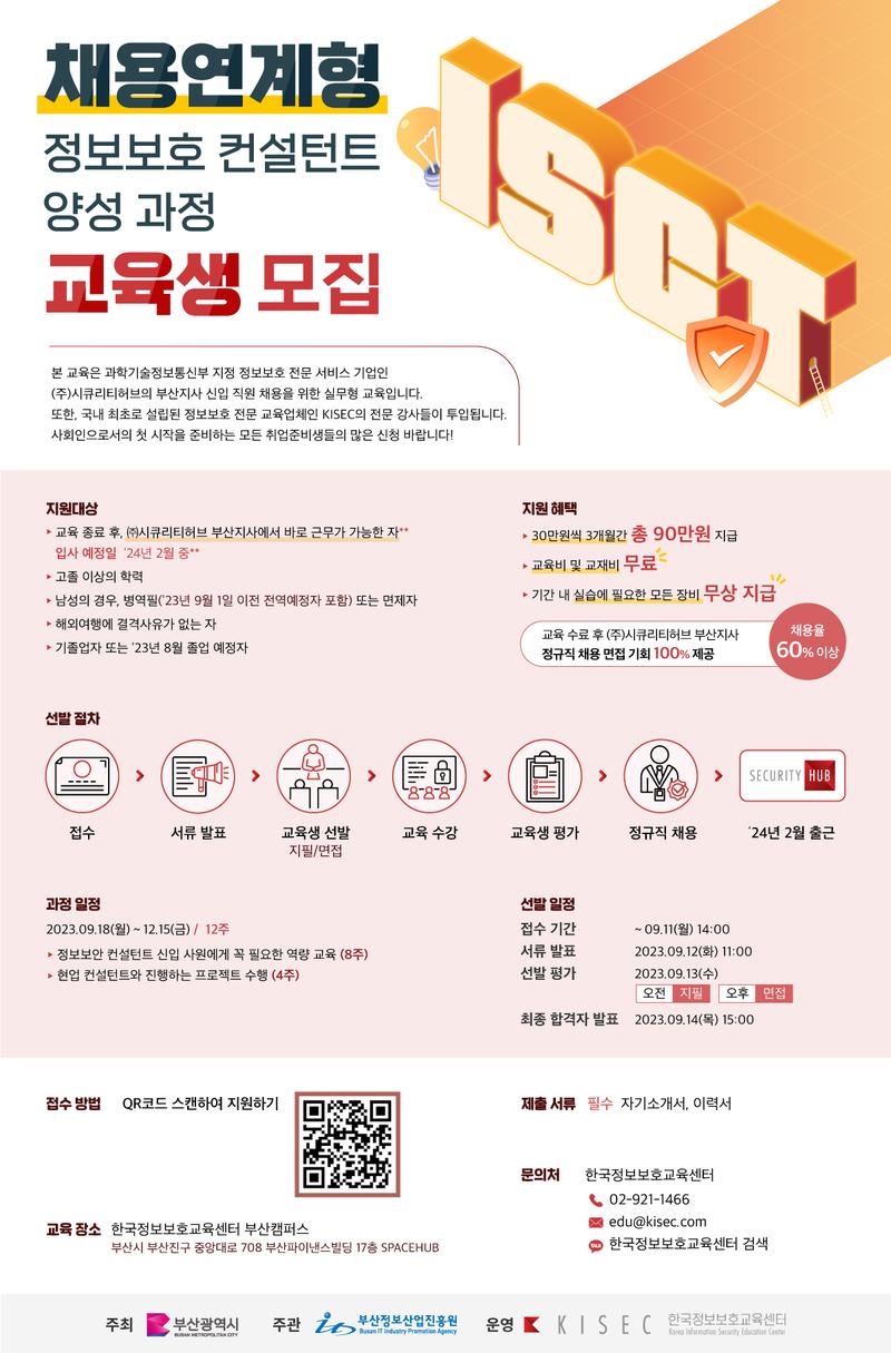 ⊙ 교육 수료 후 (주)시큐리티허브 부산지사 정규직 채용 면접 기회 100% 제공!