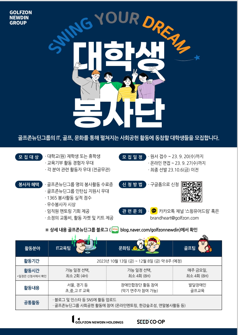 글로벌골프플랫폼 기업, 골프존뉴딘그룹에서 IT , 골프, 문화를 통한 나눔에 동참할 대학생을 모집합니다.