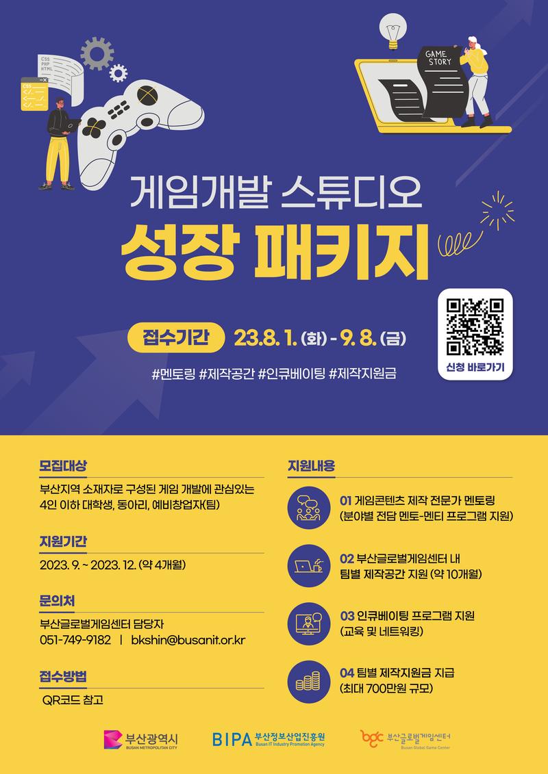 (재)부산정보산업진흥원에서 부산지역의 창의적이고 독창적인 게임 개발 인재 발굴 및 예비창업자(팀) 육성을 위하여 게임개발 스튜디오 성장 패키지 지원에 도전할 지원자(팀)을 모집합니다. 무궁한 역량과 가능성을 지닌 여러분의 많은 관심과 참여 바랍니다.