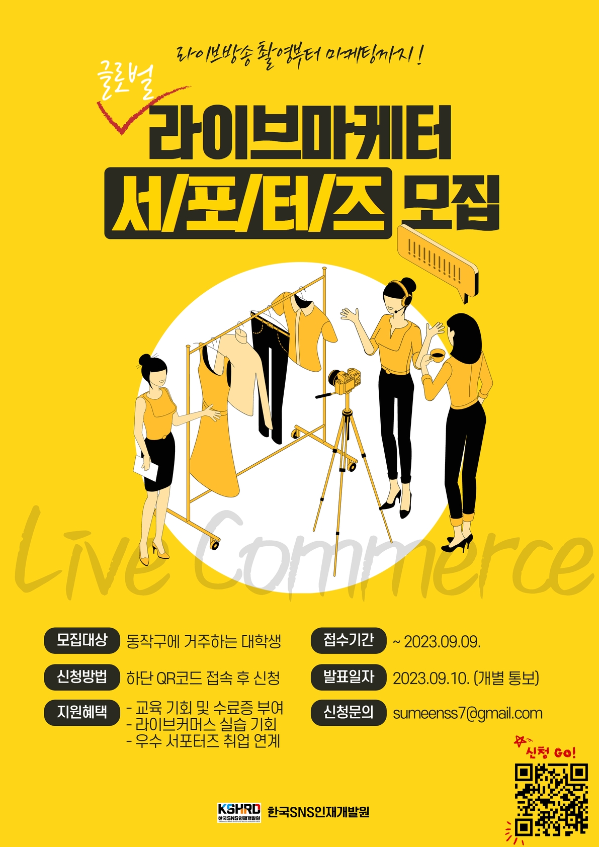 - 2023년 글로벌 라이브마케터 서포터즈를 모집하오니 여러분들의 많은 관심과 참여 바랍니다.