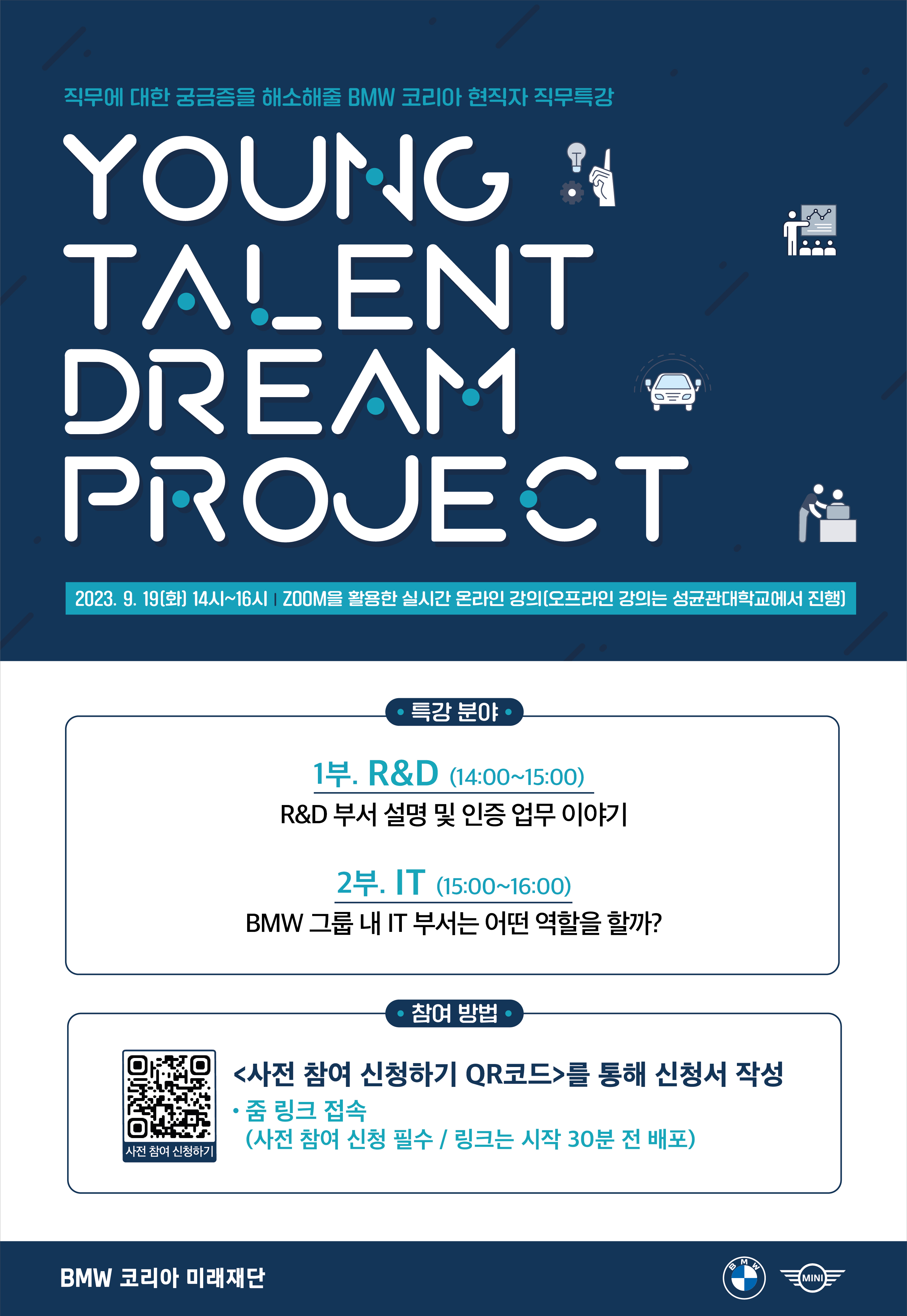 ‘영 탤런트 드림 프로젝트’는 지속 가능한 미래를 이끌어 갈 주역인 대학생이 재능을 발굴하고, 꿈을 찾아 책임감 있는 리더로 성장할 수 있도록 BMW 코리아 및 공식 딜러사 임직원의 재능 기부로 진행되는 ‘자동차 산업 특화 직무 강연’ 프로그램입니다.