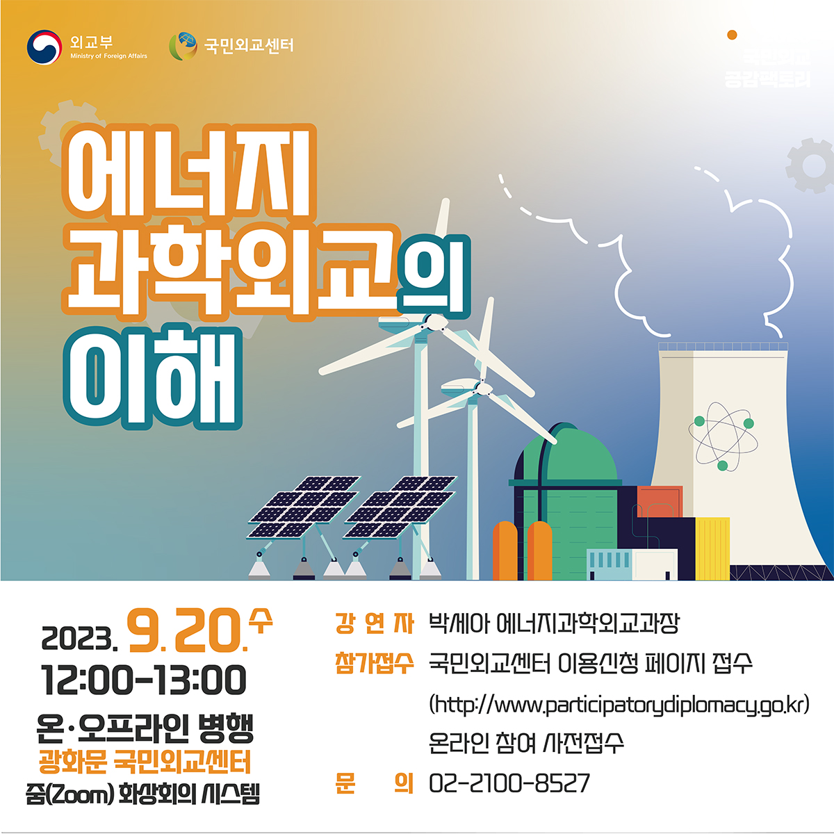 외교부는 9월 20일(수) 12:00-13:00 “에너지과학외교의 이해"를 주제로 국민외교 공감팩토리를 개최할 예정입니다.