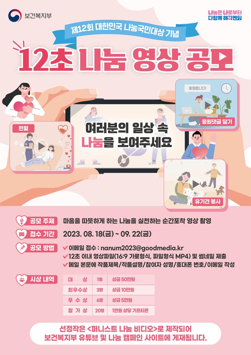 제12회 대한민국 나눔국민대상을 기념하여 12초 나눔 영상 공모를 진행합니다.