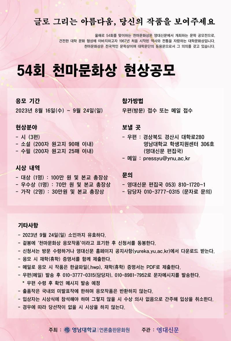 영남대학교 학보사 영대신문에서 54회 천마문화상을 개최합니다.