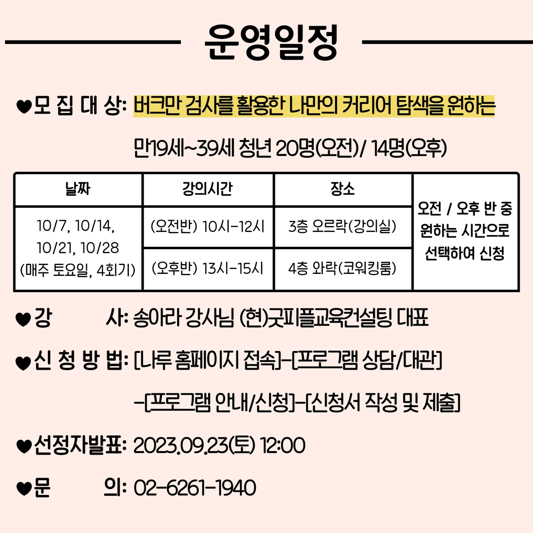 * 내용: 버크만커리어맞춤형리포트 기반 커리어탐색(자세한 내용은 포스터 참조)
