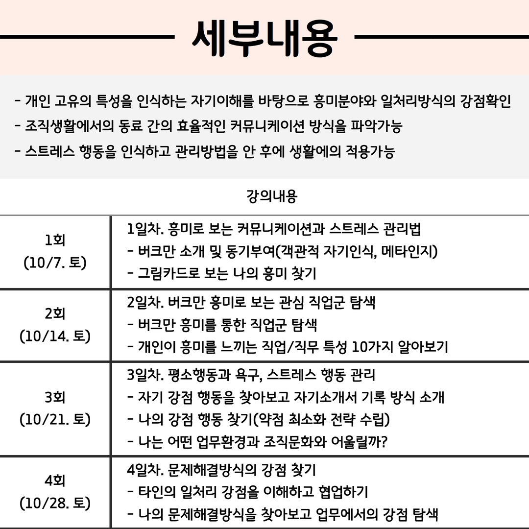 ※ 무료로 진행되는 강의로 4회기 모두 100% 참여 가능하신 분께서 신청 바랍니다.