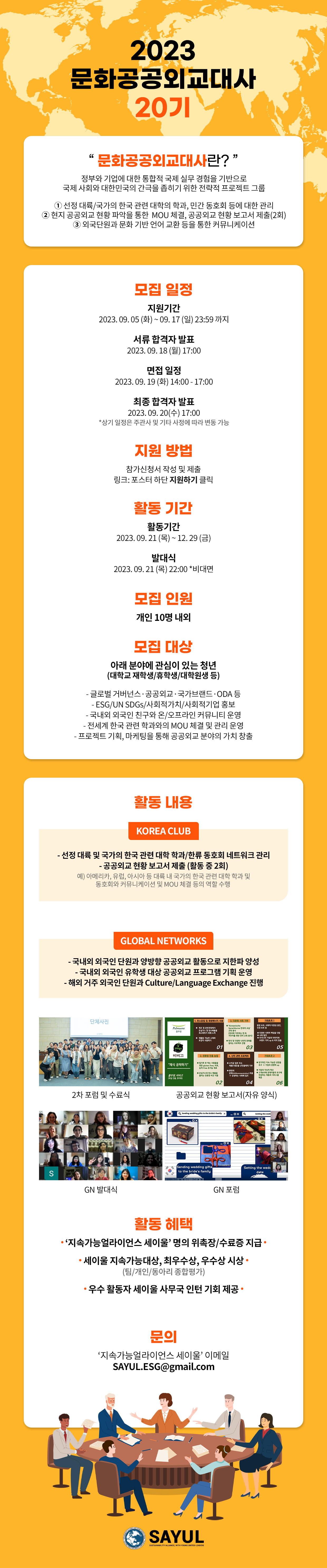 지속가능얼라이언스 세이울에서 문화공공외교대사 20기를 모집하니 많은 지원과 관심 바랍니다.