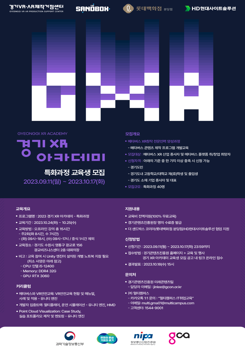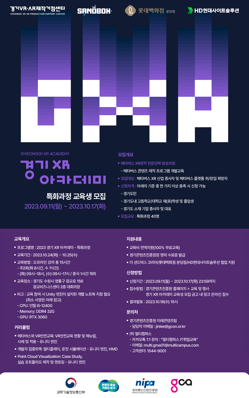 경기도와 경기콘텐츠진흥원에서는 "경기 XR 아카데미"를 통해 도내 메타버스 콘텐츠 개발자를 양성 및 재직자 실무 역량 강화를 지원하고 있습니다.