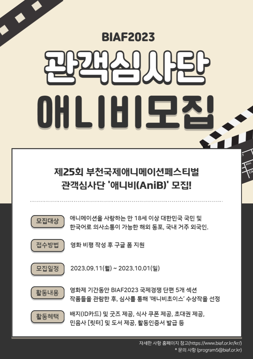 2023년 10월 20일(금)부터 24일(화)까지 열리는 제25회 부천국제애니메이션페스티벌(BIAF)에서 관객심사단 ‘애니비(AniB)’를 모집합니다!