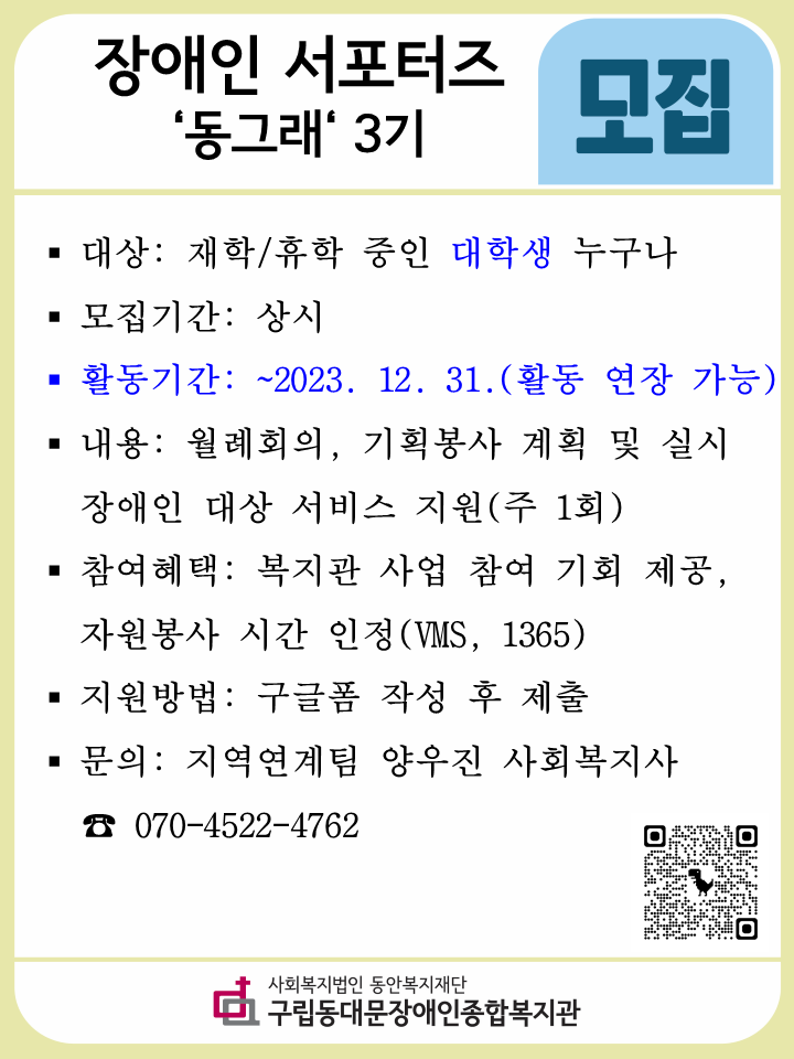 ■ 참여혜택: 복지관 사업 참여 기회 제공, 자원봉사 시간 인정(VMS, 1365)