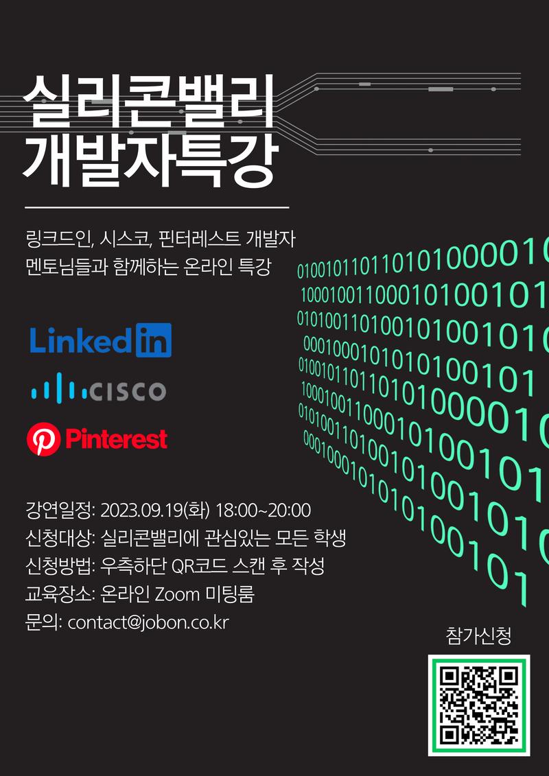 실리콘밸리 현직 개발자인 시스코(Cisco) 멘토님과, 링크드인(Linkedin), 핀터레스트(Pinterest) 멘토님께서 실리콘밸리 개발자에 대한 이야기를 해주실 예정입니다!