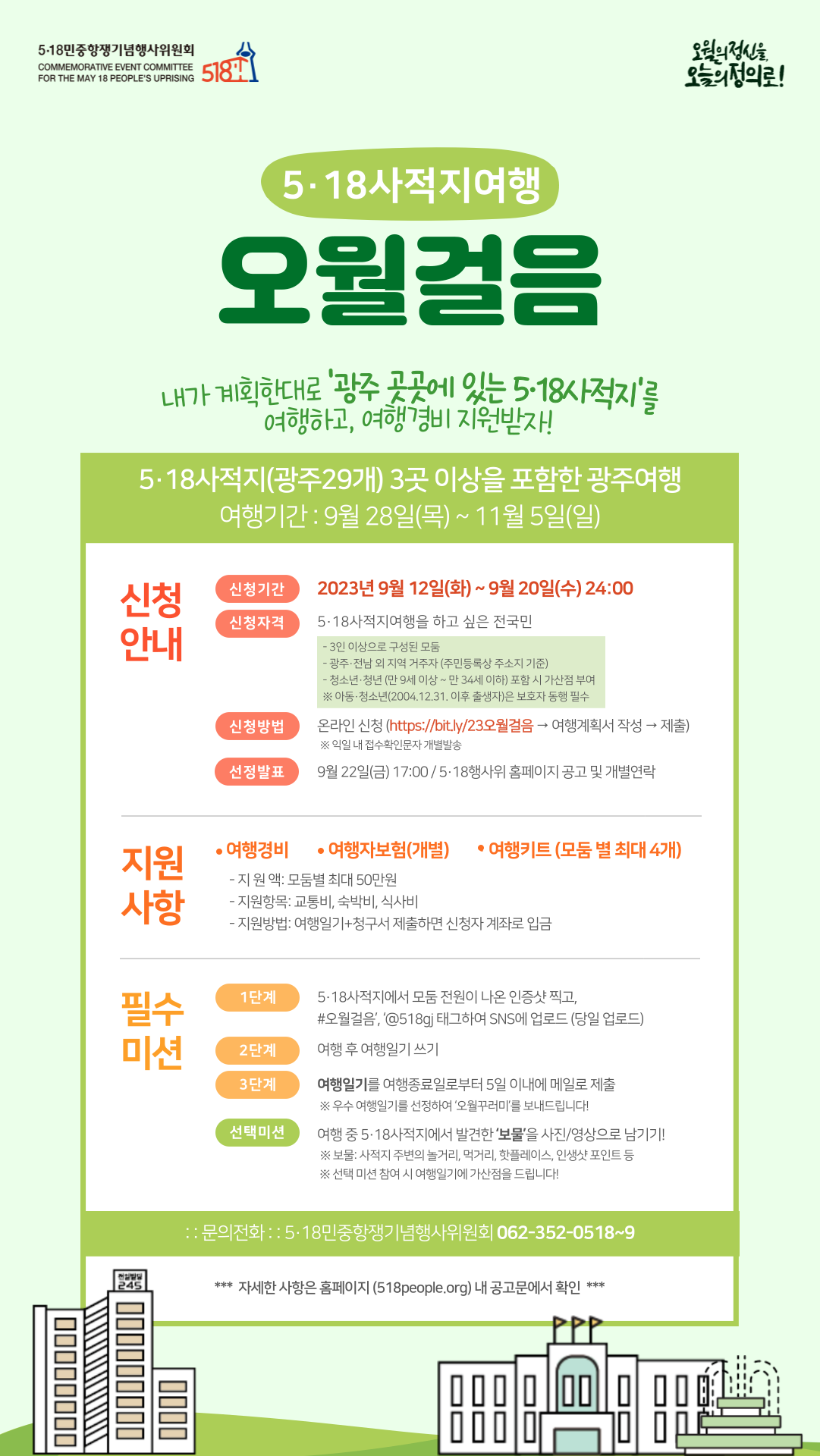 ☞ 신청안내 • 신청기간: 2023년 9월 12일(화) ~ 9월 20일(수) 24:00 • 신청자격: - 5·18사적지여행을 하고 싶은 광주·전남 외 지역 거주자 - 3인 이상으로 구성된 모둠 - 모둠 구성원 청소년·청년 (만9세 이상 ~만 34세 이하) 포함 시 가산점 부여 - 아동·청소년 (2004.12.31. 이후 출생자)은 보호자 동행 필수 • 신청방법: 홈페이지 공지사항 내 온라인 신청(https://518people.org//bbs/board.php?bo_table=notice&wr_id=240) • 선정방법: 1차 서류심사 / 2차 심의심사 • 선정 및 발표: 9월 22일(금) 17:00 / 518행사위 홈페이지 공고 및 개별연락
