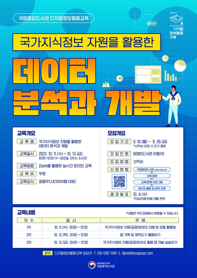 국립중앙도서관에서는 공공데이터의 이해와 활용 능력 향상을 위한 <국가지식정보 자원을 활용한 데이터 분석과 개발> 교육을 다음과 같이 개최합니다. 관심 있는 분들의 많은 참여를 바랍니다.