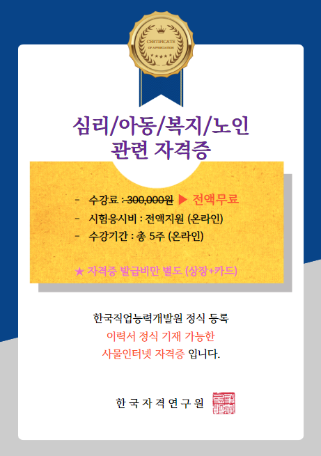 - 심리상담사 아동 복지 노인 인강자격증(300,000원) 무료 제공