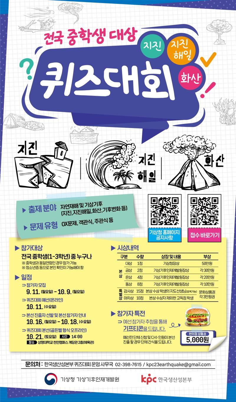 2023년 전국 중학생 대상으로 진행되는 "지진·지진해일·화산 퀴즈대회"에 여러분을 초대합니다.