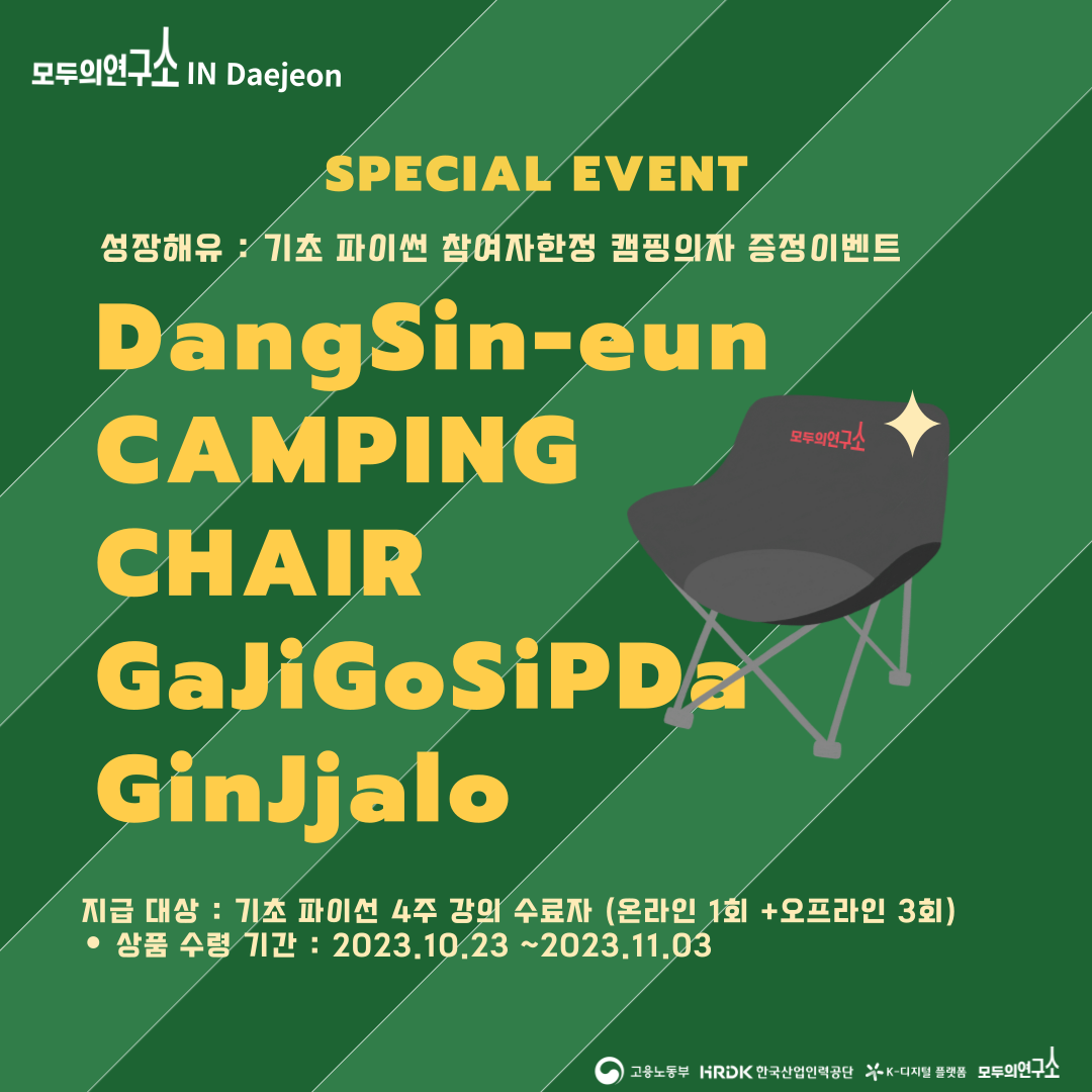 전체 과정 수료자(4회차 강의 수강)에게는 모두의연구소 굿즈 캠핑체어를 드립니다!