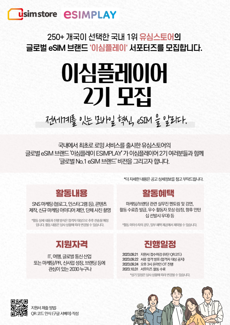 아직 여행 가실 때 심카드를 갈아끼우시나요? 2022.09 부터 국내에서도 QR코드 인증만으로 전세계에서 언제 어디서나 데이터 로밍을 가능하게 하는 eSIM 서비스가 활성화되었습니다. 국내 최초로 포털 로밍 서비스를 시작한 유심스토어의 글로벌 eSIM 브랜드 '이심플레이'와 함께하실 분을 찾습니다.