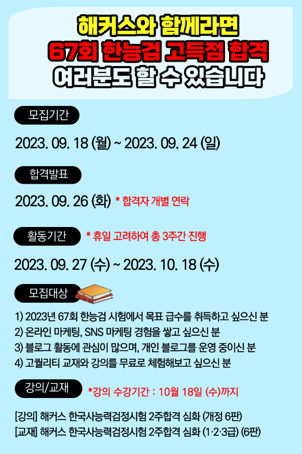 무료로 체험해보실 수 있는 [해커스 한능검 67회 대비 교재+인강 서포터즈]를 모집합니다.