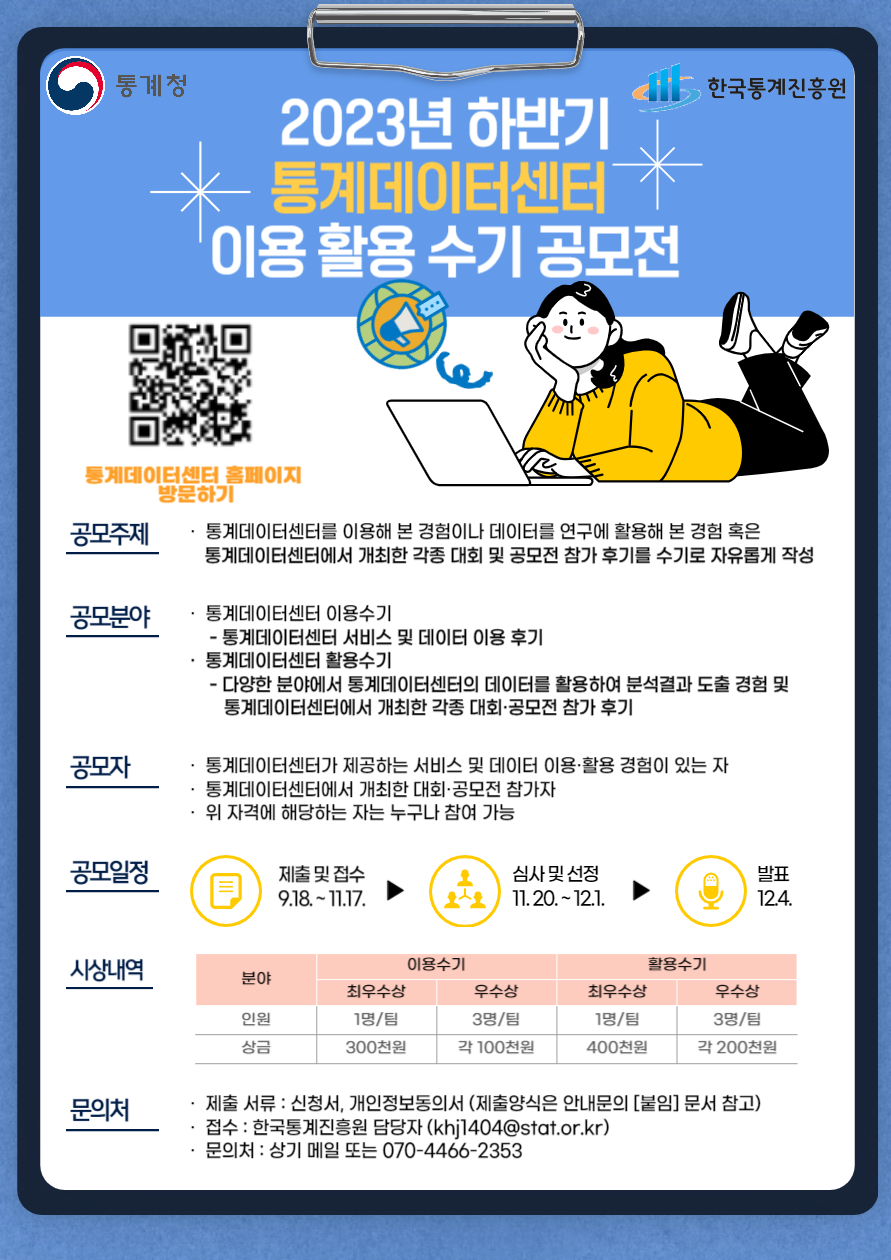 자세한 사항은 첨부된 '2023년 하반기 통계데이터센터 이용 · 활용 수기 공모 안내문'을 참고하시기 바랍니다.