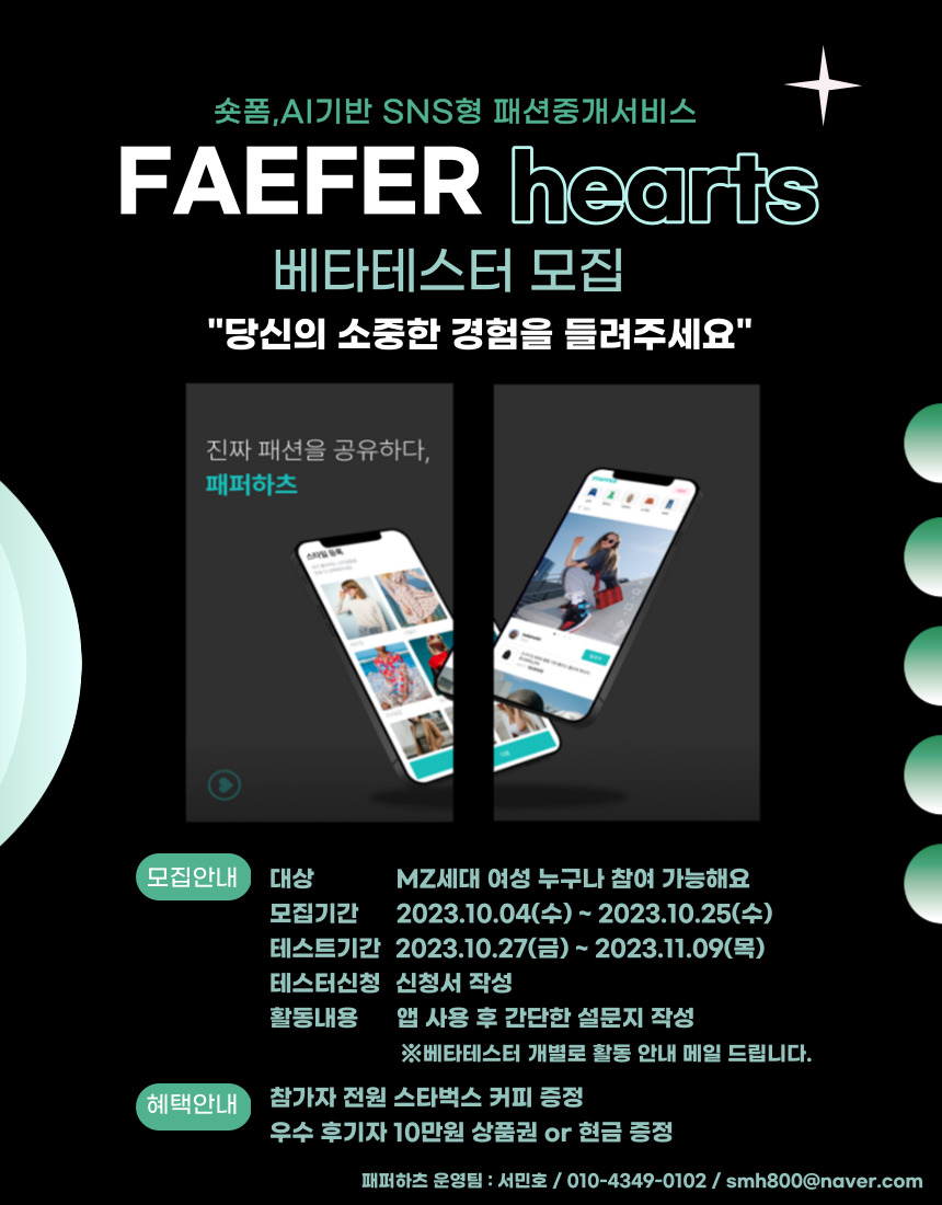 안녕하세요! 숏폼,AI기반 패션중개서비스 "패퍼하츠"💖를 준비하는 팀입니다. 정식 론칭 이전에 패퍼하츠를 사랑해주실 여러분의 목소리를 듣고자 베타 테스트를 진행합니다. 진정성을 갖춘 가치 있는 서비스로 발전하고자 합니다.