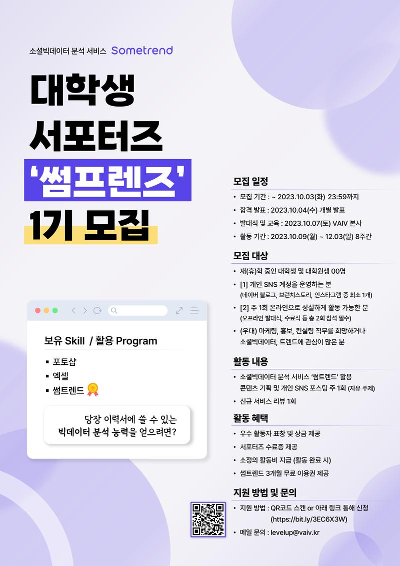 바이브컴퍼니(구 다음소프트)에서 소셜빅데이터 분석 서비스 썸트렌드 대학생 서포터즈 ‘썸프렌즈’ 1기를 모집합니다. ‘모두가 인공지능, 빅데이터를 쉽게 활용하여 더 나은 선택을 하는 세상’을 만들고자 하는 바이브컴퍼니의 서포터즈 활동에 많은 관심과 참여 부탁드립니다!