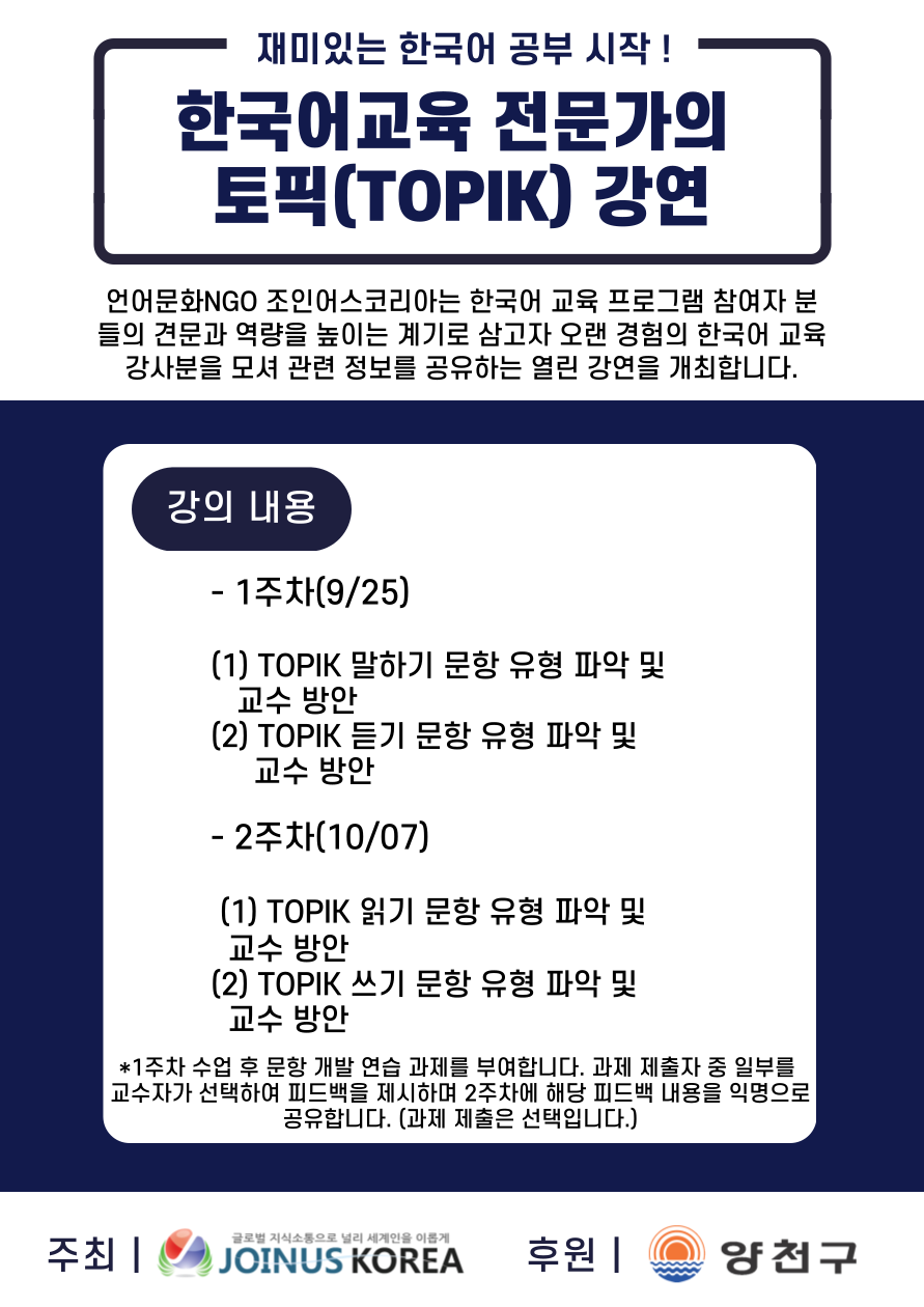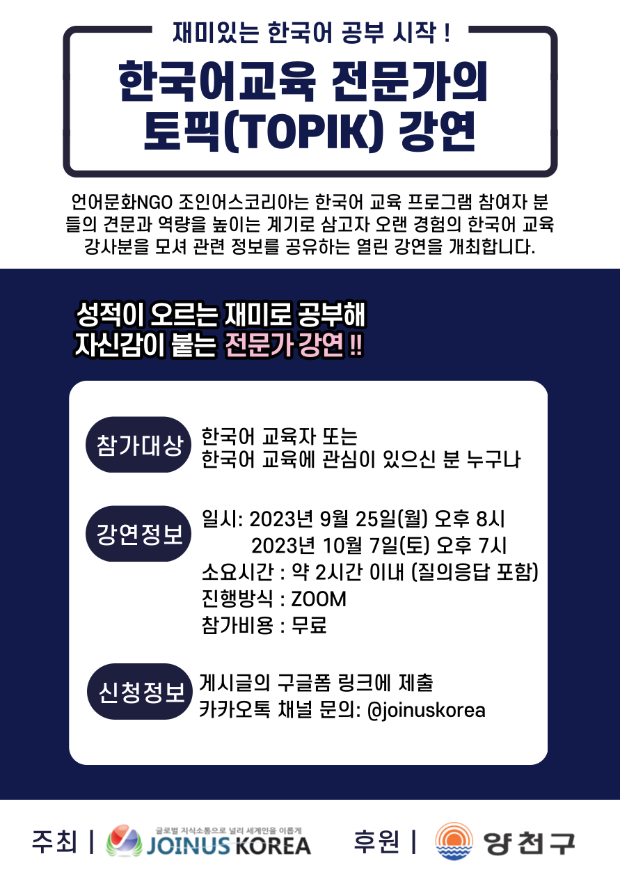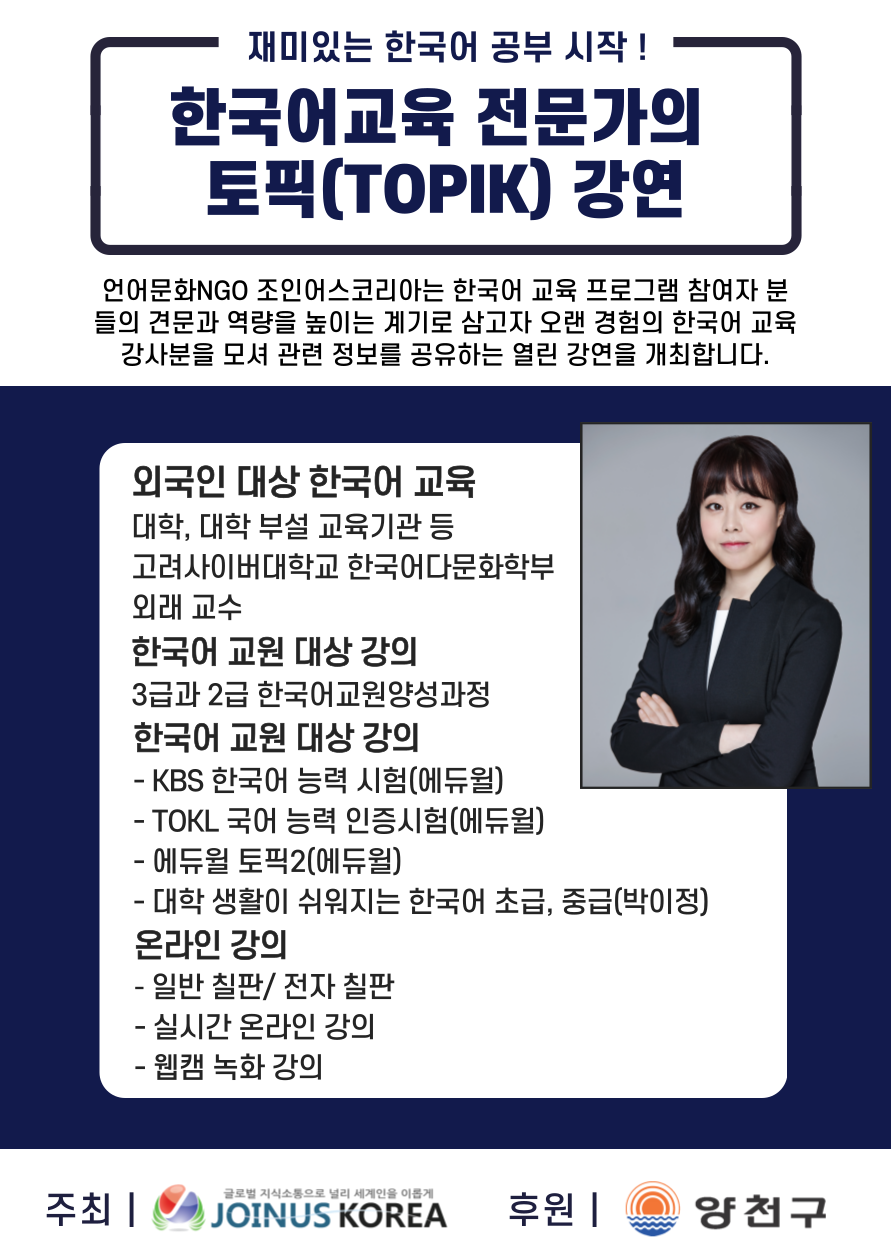 조인어스코리아는 한국어 교육 프로그램 참여자 분들의 견문과 역량을 높이는 계기로 삼고자 한국어 교육 강사분을 모셔 관련 정보를 공유하는 열린 강연을 개최합니다.