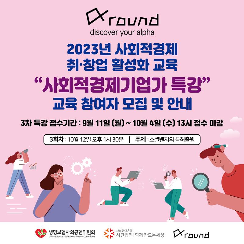 - 접수방법: 알파라운드 홈페이지(https://alpharound.or.kr/f1/p2.php) > 일자리 > 교육지원> 사회적경제 기업가 특강 3차