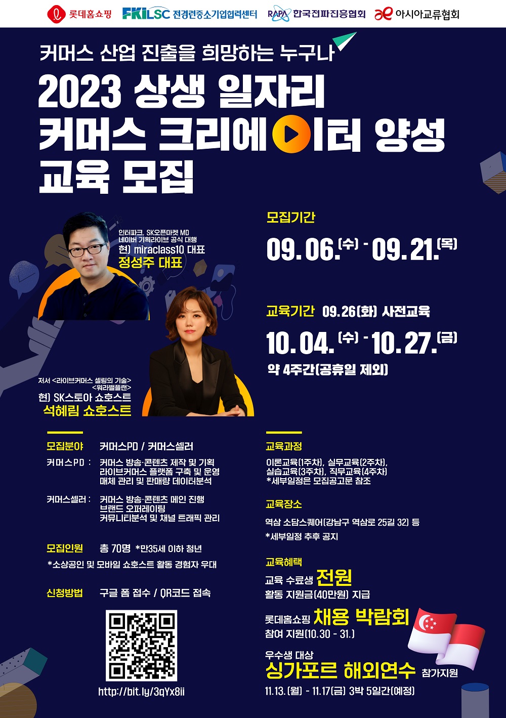 「2023년 상생 일자리 커머스 크리에이터 양성 교육」은 커머스 산업 진출을 희망하는 구직 청년들에게 ▲커머스 크리에이터 전문 교육 ▲유통 직무 교육 ▲싱가포르 해외 연수 등 제공을 통해 국내 유통업 및 미디어 콘텐츠 융합 분야로의 취업 연계를 지원하는 프로그램입니다.