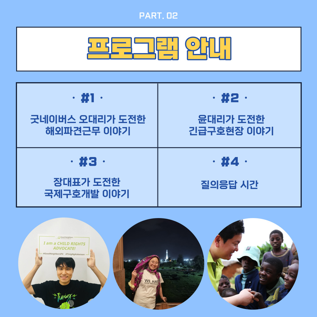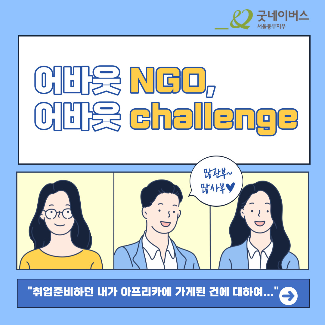 안녕하세요. 굿네이버스 서울동부지부에서는 해외파견, 긴급구호활동현장, 국제개발사업에 관심 있는 대학생들을 초대합니다 :)