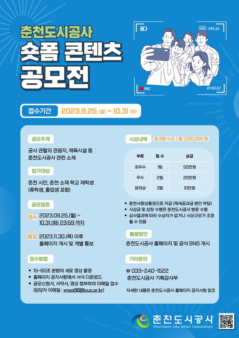 ◦ 접수된 서류 일체는 반환되지 않으며, 채택된 영상의 소유권과 초상권 등 모든 저작권은 춘천도시공사에 귀속됨.