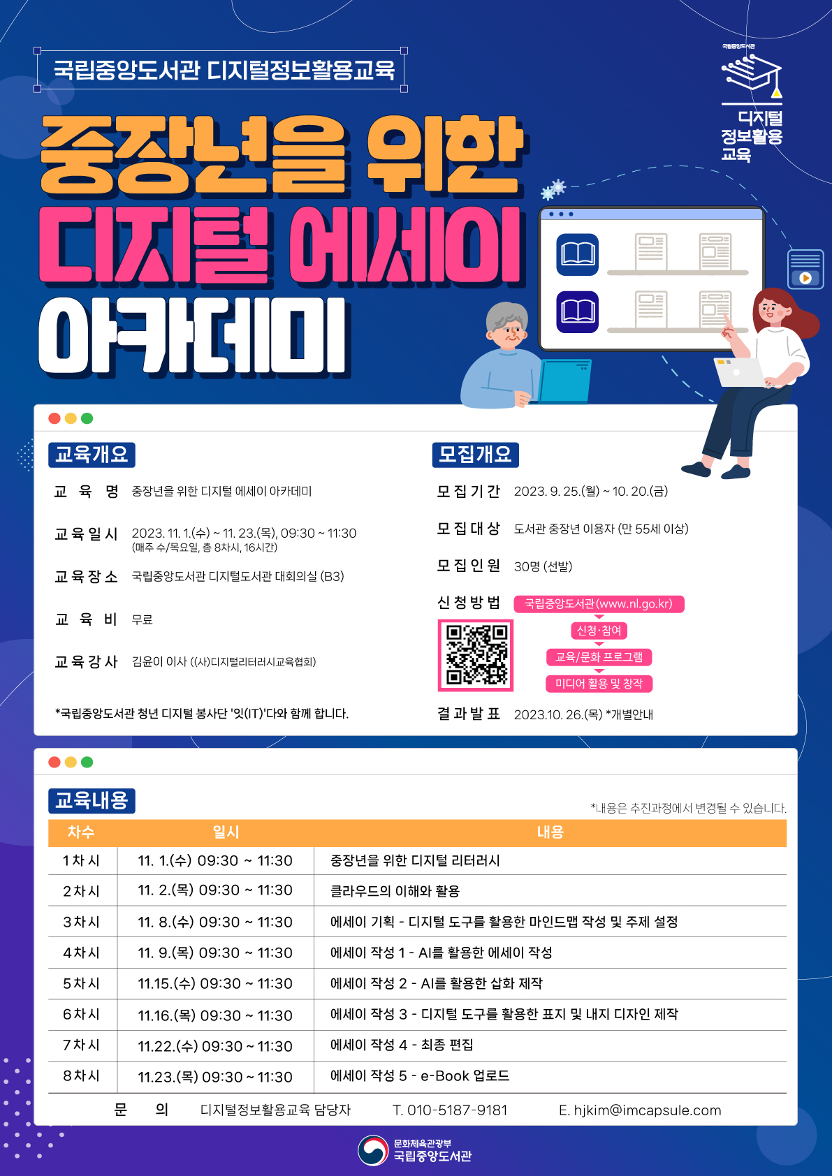 국립중앙도서관에서 디지털 리터터시 아카데미로 「중장년을 위한 디지털 에세이 아카데미」를 실시합니다. 「중장년을 위한 디지털 에세이 아카데미」는 중장년층이 디지털 에세이 창작 경험을 통해 디지털 사회 구성원으로서 적극적으로 소통하고 참여할 수 있도록 교육하는 과정입니다. 중장년을 위한 디지털 리터러시에 관심 있는 분들의 많은 참여 바랍니다.