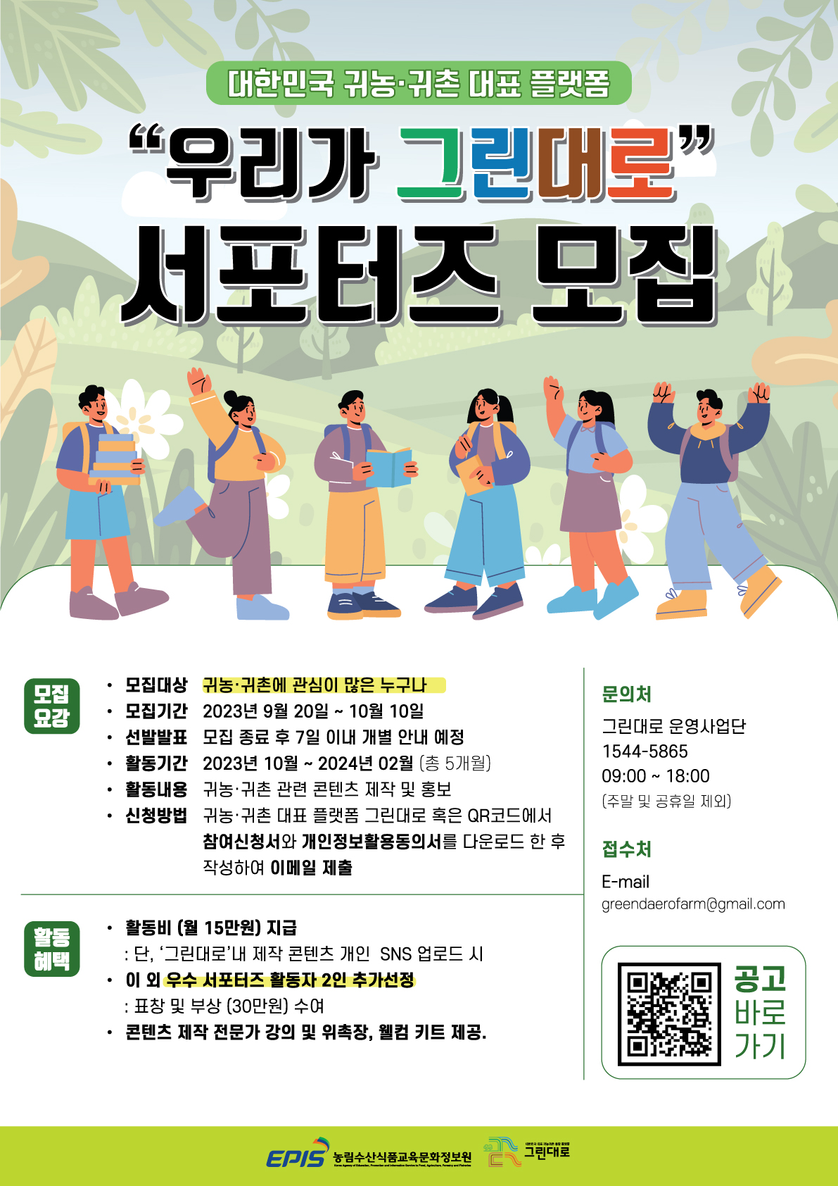 - 2023년 귀농귀촌통합플랫폼 '우리가그린대로' 서포터즈를 모집합니다.