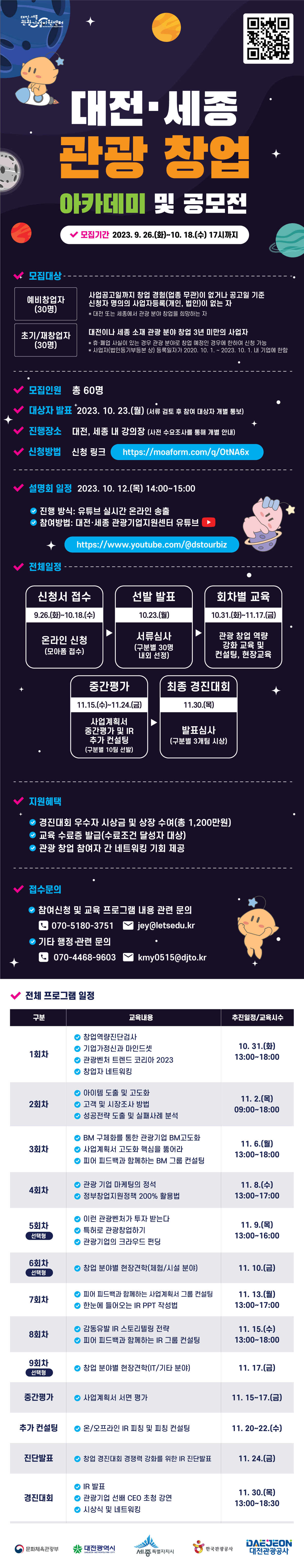 - 모집 대상 : 대전·세종 관광 분야 예비 창업자, 초기/재창업자 개인 또는 4명 이내 팀