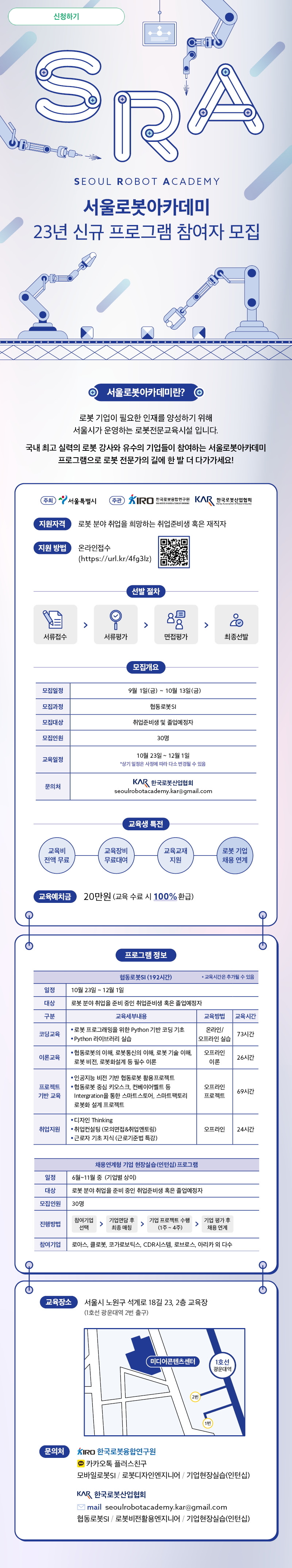 아래와 같이 2023년 서울로봇아카데미 "협동로봇SI 교육과정"의 교육생 모집을 진행 중입니다.