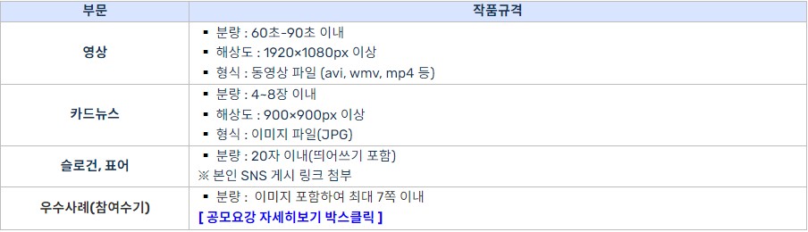 - 공모부문: 영상, 카드뉴스, 슬로건·표어, 우수사례(참여수기)