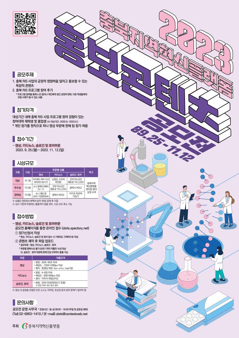 충북지역혁신플랫폼은 참여자가 직접 만드는 홍보콘텐츠를 통해 사업의 신뢰도와 긍정적 이미지를 제고하고 참여자 간 소속감을 고취시키기 위해 「2023 충북지역혁신플랫폼 홍보콘텐츠 공모전」을 개최합니다. 충북 RIS 사업 프로그램 참여 경험이 있는 참여대학 재학생 및 졸업생분들의 많은 참여 바랍니다.