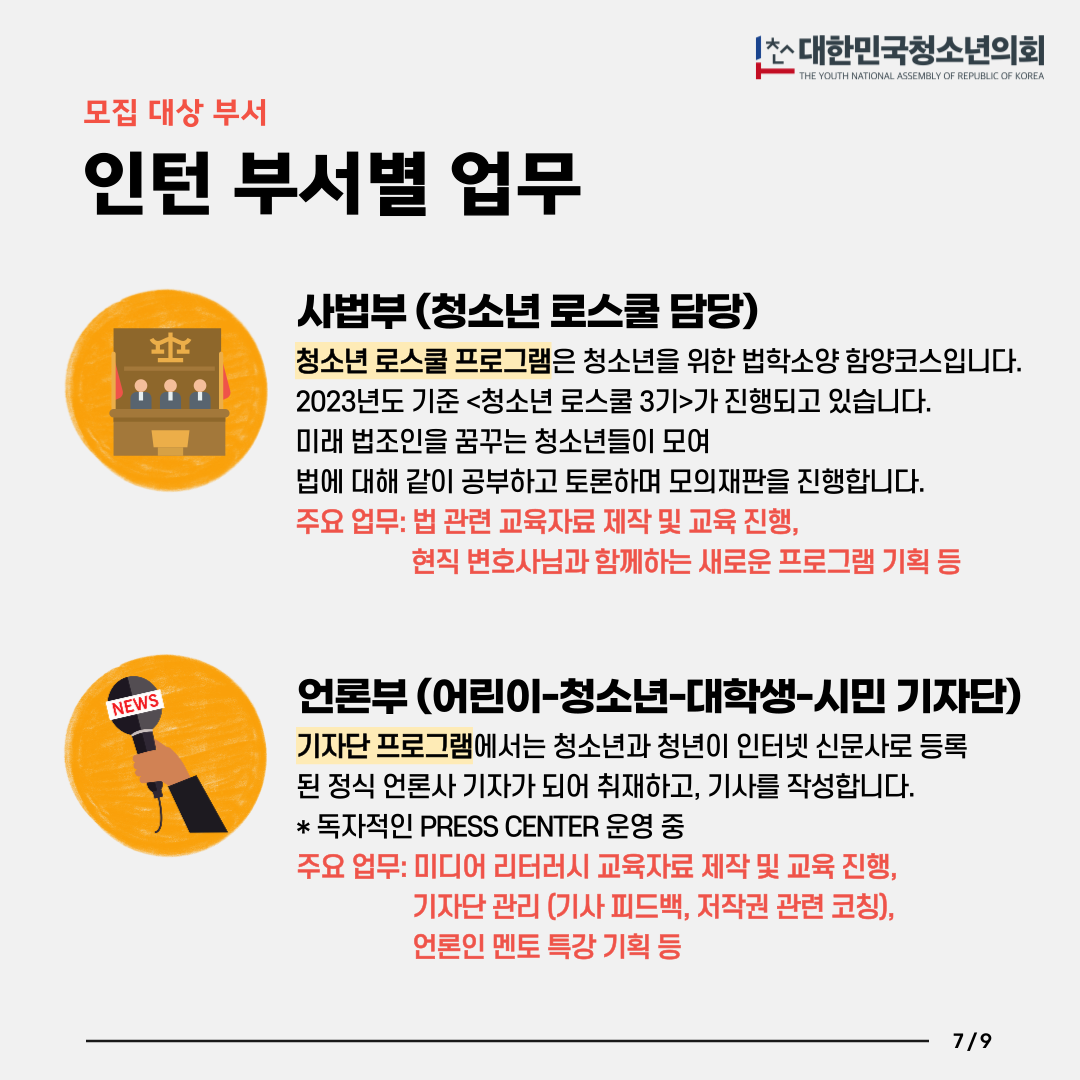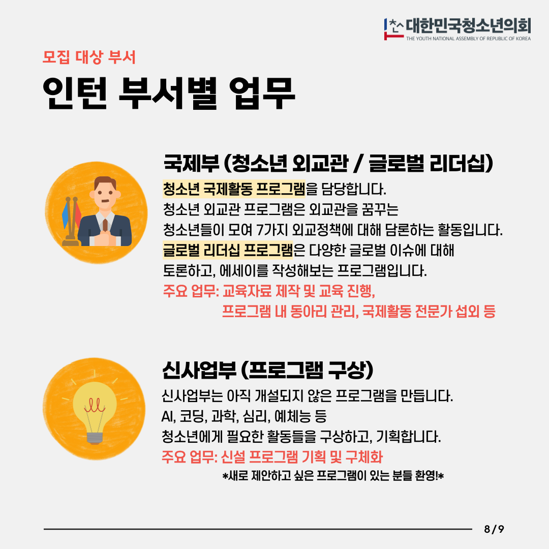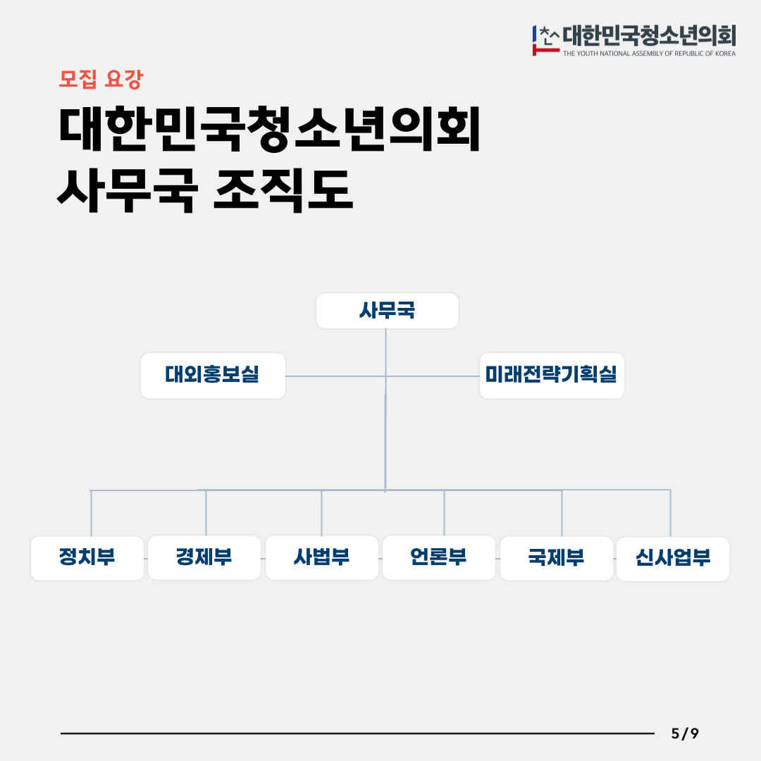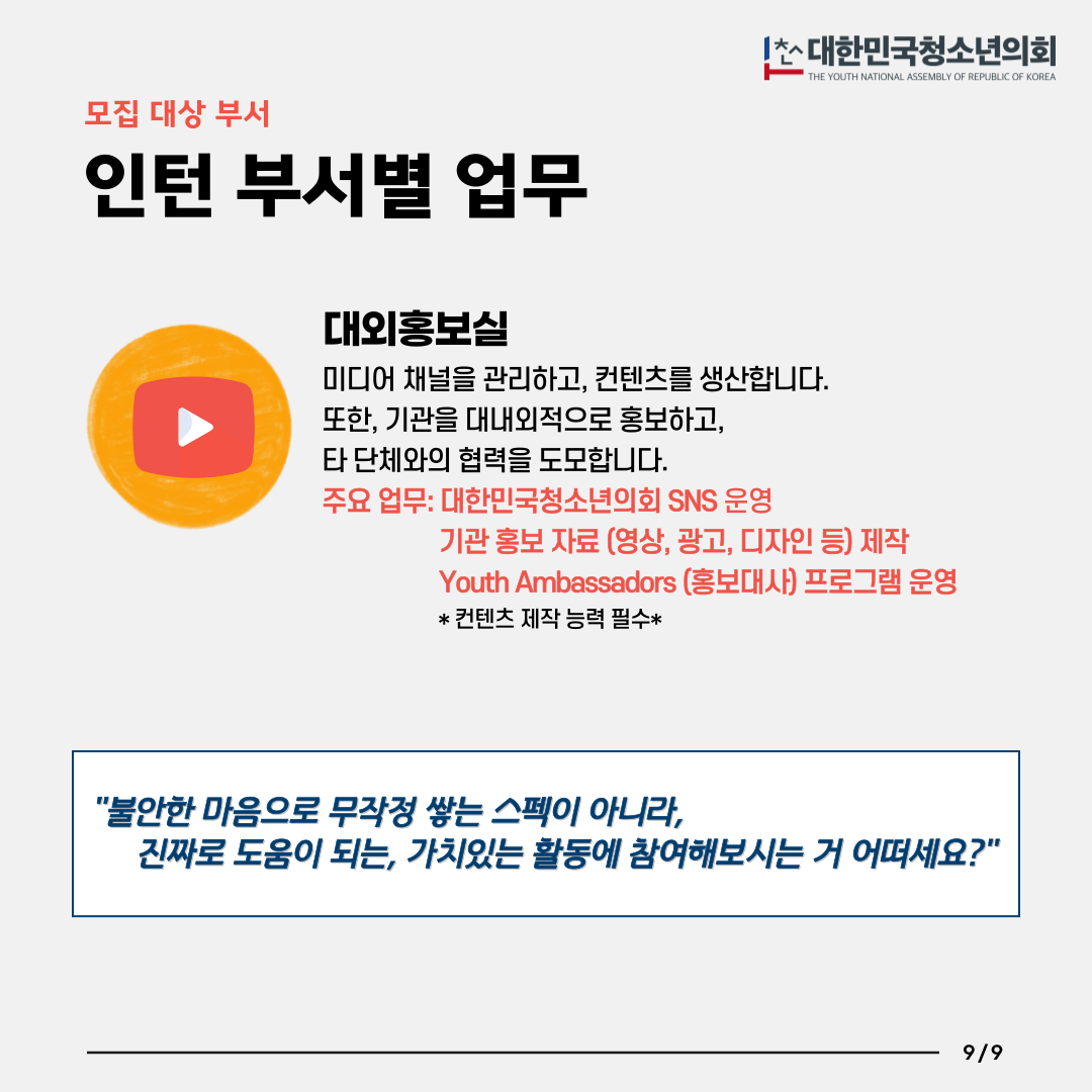 - 대외홍보실: 대한민국청소년의회 SNS운영, 기관 홍보자료 제작, Youth Ambassadors (홍보대사) 프로그램 운영