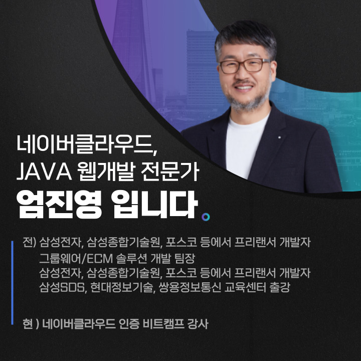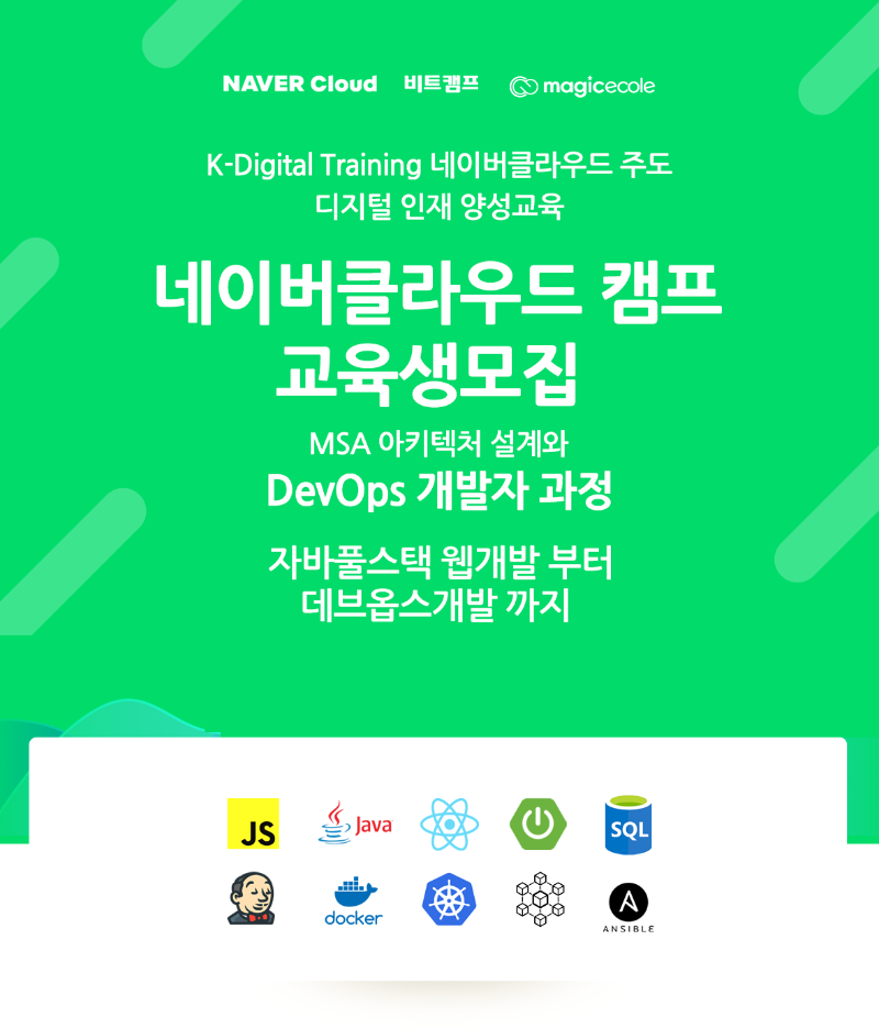' 비전공, 전공자를 불문하고' 실무경험이 없는 개발자를 위해 네이버클라우드가 직접 커리큘럼과 강사진을 선별하여 비트캠프가 운영하고 있는 웹 개발자 양성 과정입니다.