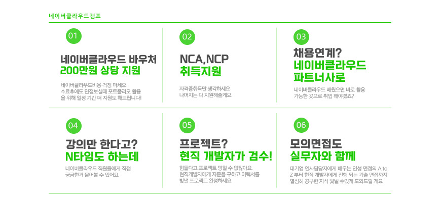 - 취업이 목적이 아닌 개발자로써의 성장을 목표로 네이버클라우드가 커리큘럼을 구성 하였습니니다. 실전에 돌입하면 사수없이 일하거나, 누구의 도움 없이 다양한 문제에 직면하게 되는 상황이 올 수 있습니다. 그럴때 탄탄한 기초가 있다면 어떠한 환경이라도 해결할 수 있습니다.