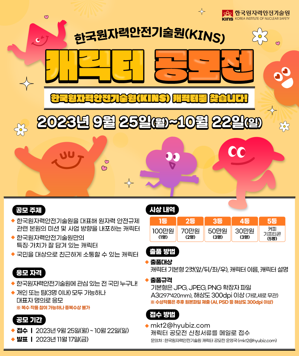 주제 | - 한국원자력안전기술원을 대표해 원자력 안전규제 관련 본원의 미션 및 사업 방향을 내포하는 캐릭터 - 한국원자력안전기술원만의 특징·가치가 잘 담겨 있는 캐릭터 - 국민을 대상으로 친근하게 소통할 수 있는 캐릭터 | ||||||||