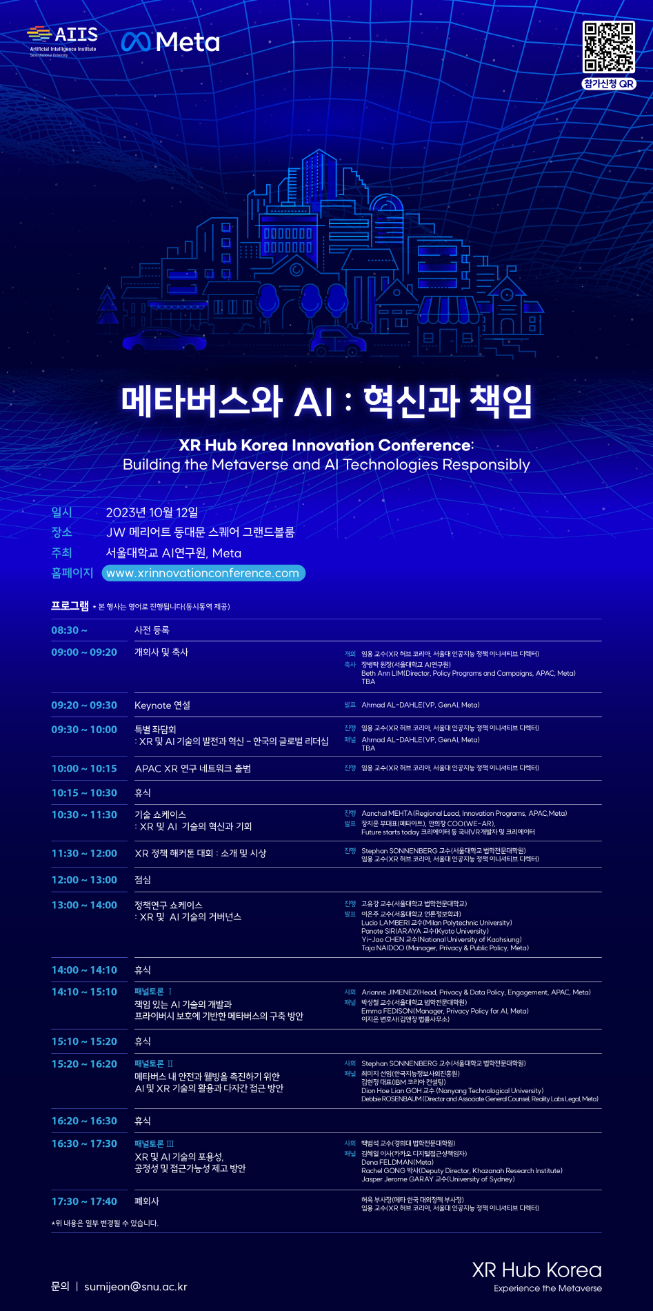 - 주요프로그램: 개회사 및 축사, Keynote 연설, 특별 좌담회, APAC XR 연구 네트워크 출범, 기술쇼케이스, XR 정책 해커톤, 정책연구쇼케이스, 패널토론, 폐회 *상세 프로그램 포스터 참고